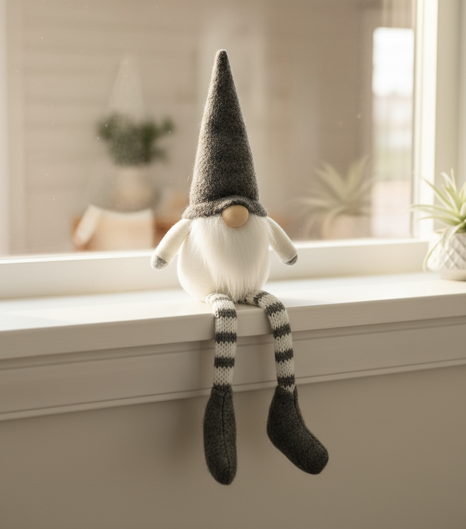 A delightfully festive themed fabric shelf sitting gonk with long dangly legs and a high pointed hat