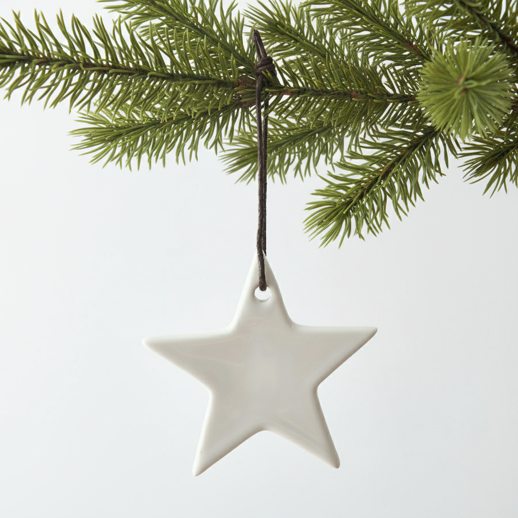 A decorative hanging ceramic star with a black string to give it a Contemporary Look